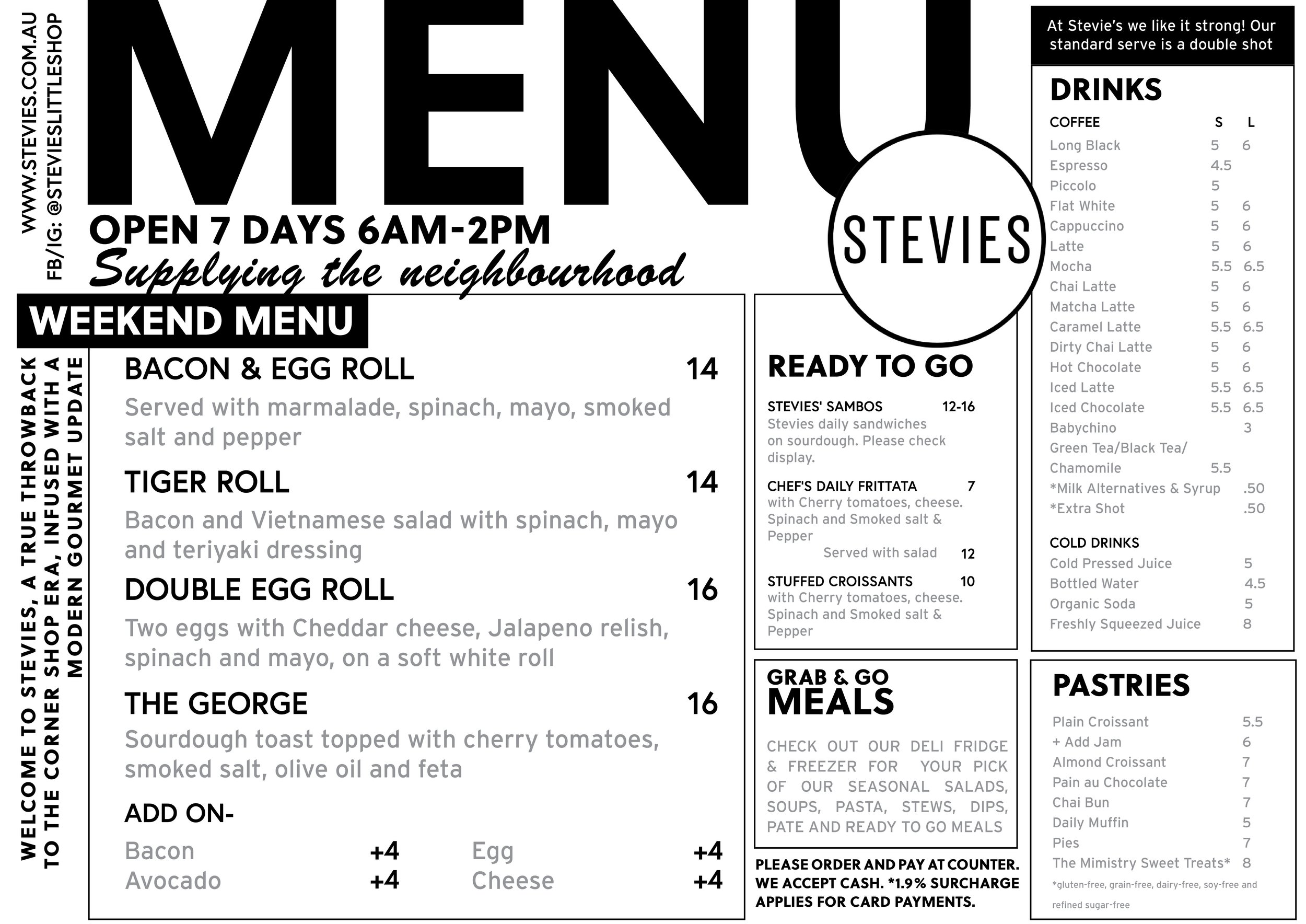 You’ll find a fresh, everyday Weekday Menu for your morning coffee, quick lunches, and all your Stevie’s favourites.